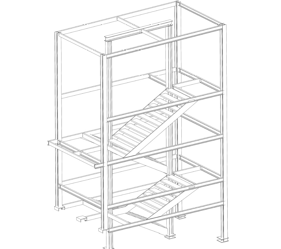Disegno tecnico in 3D scala in ferro antincendio.