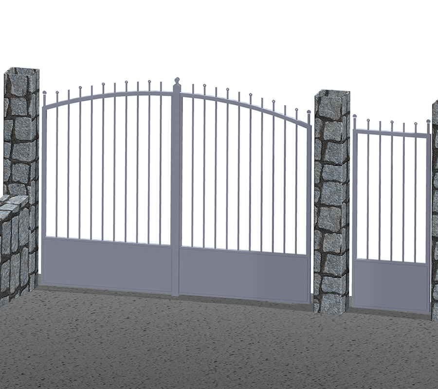 Rendering cancello in ferro per passaggio auto e pedonale abitazione privata.